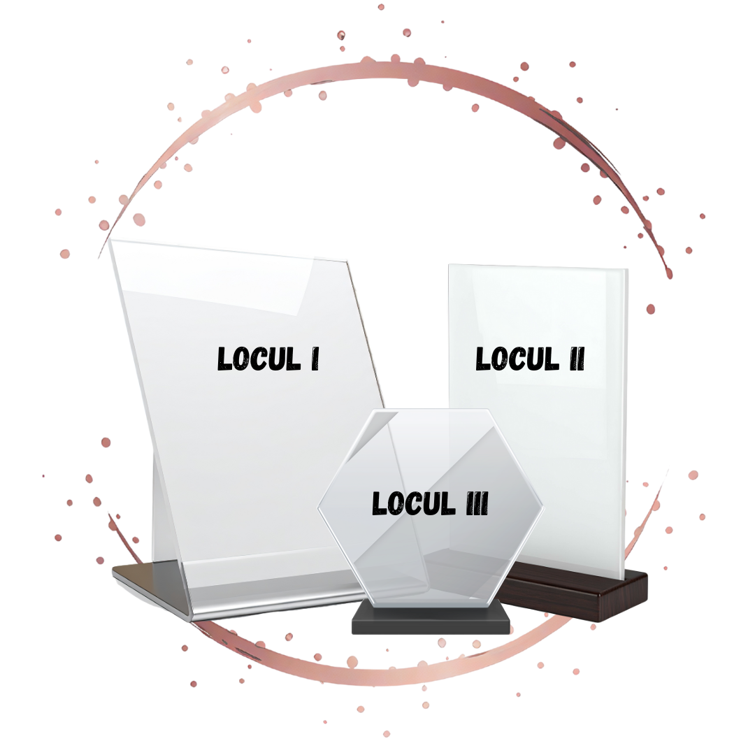 Un trofeu elegant construit sub formă de ramă, personalizat cu mesajul de felicitare și numele destinatarului.